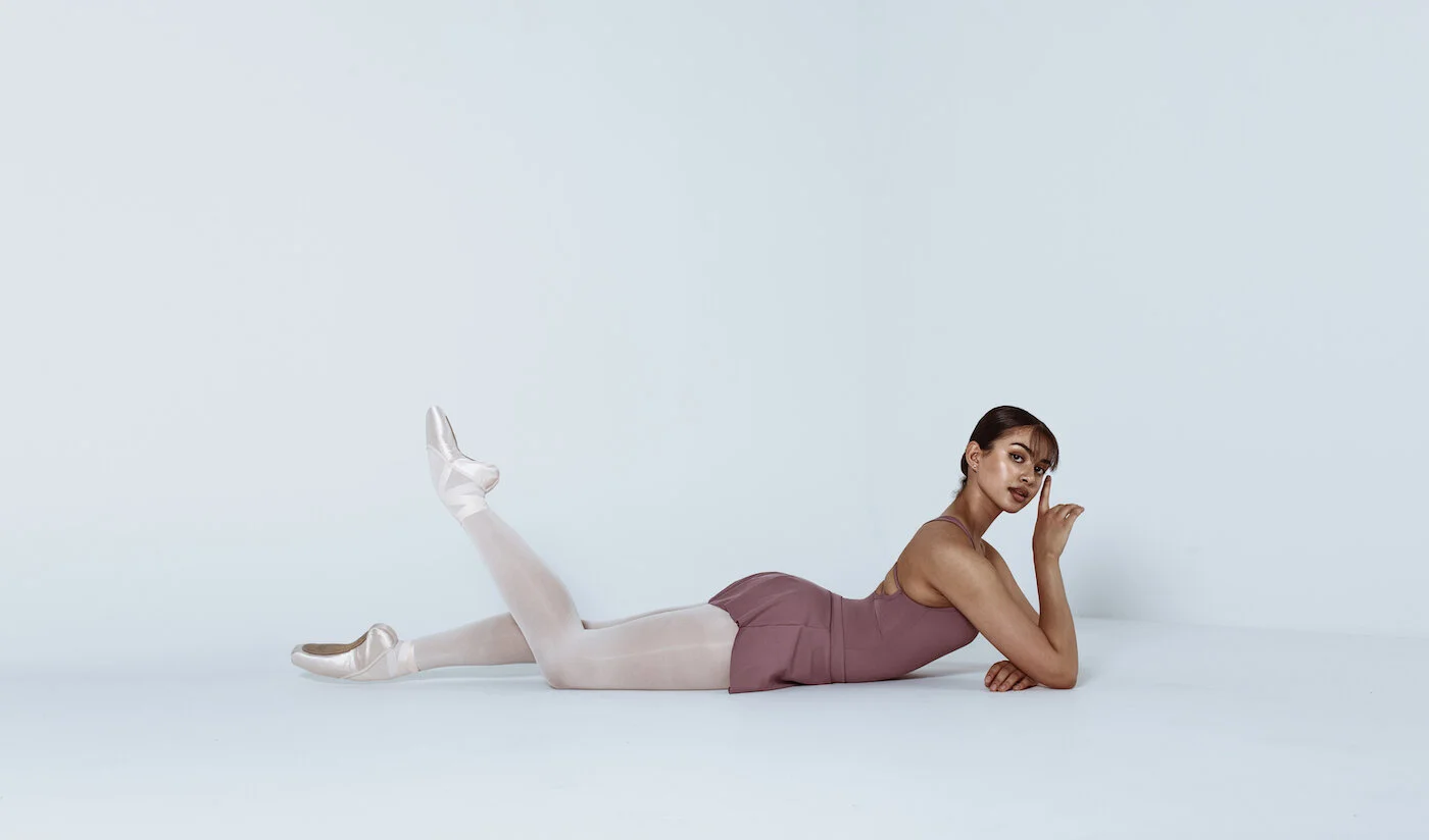 Zoe wears the Isabelle Lace Leotard in Navy and the Pivot 360.