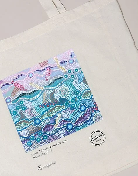 As part of this process, Energetiks are honoured to collaborate with contemporary First Nations artist Clara Trindall of Krubi Creative, a proud descendant of the Burra Burra and Burragorang clan groups of the Gundungurra nation. Her stunning artwork features as one of two designs offered on our limited edition Energetiks charity bags, currently available instore and online. 100% of the profits of all bag sales will be donated to the Rekindling Youth Program and Bangarra’s Regional Workshops. We recently spoke with Clara to gain more of an insight into her art, process and experience as a proud descendant of the Burra Burra and Burragorang clan groups of the Gundungurra nation.