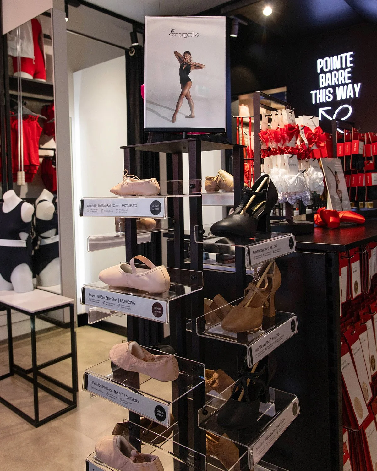 As customers moved through the sea of colourful garments, their eyes were caught by the ‘POINTE BARRE THIS WAY’ sign leading them to the dedicated pointe shoe fitting room. Featuring an abundance of Energetiks pointe shoes and cute accessories, many were in awe of the iconic mirror ceiling and had their own private fitting with our experienced pointe shoe fitters.